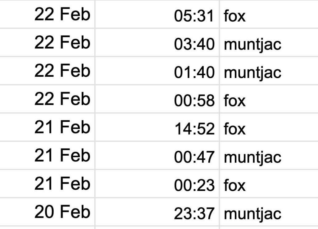 Last night we had an interesting series of visits. 23:37 saw the return of the muntjac and then again at 00:47. In between these visits at 00:23 the fox came. I’m waiting for the day when they both come at the same time, from different directions. Sparks might fly.