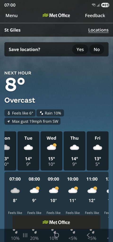 One other thing. I woke up in the night and for some reason checked the weather forecast. The metoffice told me there would be no weather next wednesday. This morning I checked again and they had changed their mind. Gosh.