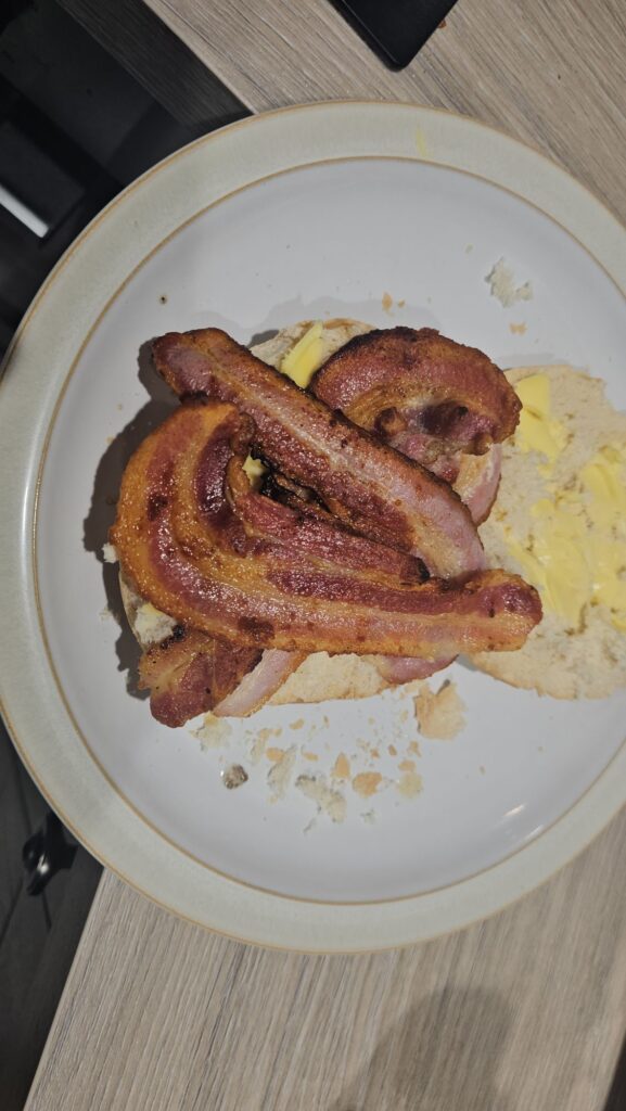 Good night’s kip, although some pesky gulls chose to have a chat at some point in the night, and then a good breakfast. The local butcher’s smoked bacon is seriously good and I added fried leftover spuds and an egg on top of avocado on toast. THG did an excellent of smashing the avo and left me some for my own use. Won’t need lunch now and I can save the remaining bread roll for a bacon butty tomorrow morning.